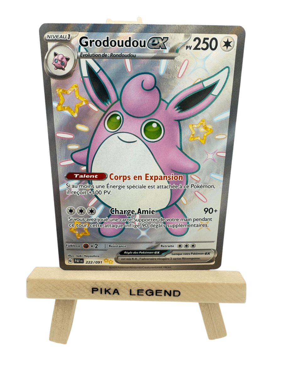 Ajoute à ta collection la magnifique Grodoudou EX (PAF 222), issue de la série Destinées de Paldea. Cette carte exceptionnelle présente Grodoudou, un Pokémon emblématique connu pour sa voix envoûtante et ses capacités de soutien. Dotée de puissantes attaques et d'une illustration spectaculaire, cette carte EX est un véritable atout tant pour les collectionneurs que pour les joueurs. Avec son design éclatant et ses capacités stratégiques, Grodoudou EX saura renforcer tes decks et te surprendre dans tes batailles. Ne manque pas cette carte rare, incontournable pour tout fan de l'univers Pokémon et de la région de Paldea.