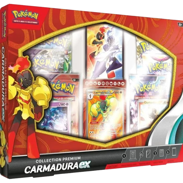 Le Pokémon Carmadura est un allié à la fois redoutable et intrépide, prêt à affronter tous les défis avec sa puissance dévastatrice ! Grâce à la Téracristallisation, Carmadura atteint de nouveaux sommets de force ! Dans cette collection, vous aurez l'occasion de faire équipe avec Carmadura EX Téracristal. Vous y trouverez également une version alternative de Carmadura EX et une carte Dresseur spéciale représentant le Champion de la Légende en carte brillante. Un protecteur de carte, un ensemble de protège-cartes et des boosters compléteront cette aventure épique avec Carmadura !